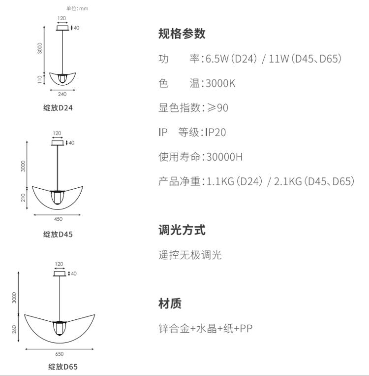 利用材料物理弹性,,,,透过巧妙的结构,,灯罩在空间里呈现一个富有张力和生机的曲面,,,,仿佛在空间里热烈绽放的花朵,,,,灯罩表面采用手工敷纸工艺,,更加的朦胧舒适,,,,纸纤维的材质也让灯光更加温柔。。。。选用实心高级无铅水晶材质,,这种材料洁净无瑕的透明度与低色散特性,,硬度高,,多用于精密光学器件及高端水晶制品,,,,更好展现丰富光影质感。。。。